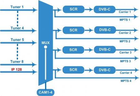 Многофункциональный QAM модулятор NDS3348C. Входы: 4 x DVB FTA, 4 x DVB CI, 128 IP SPTS/MPTS. Выходы: 4 х QAM RF, 4 x IP MPTS. Дополнительные функции: 4 слота для модулей доступа, ремультиплексирование, кодирование.